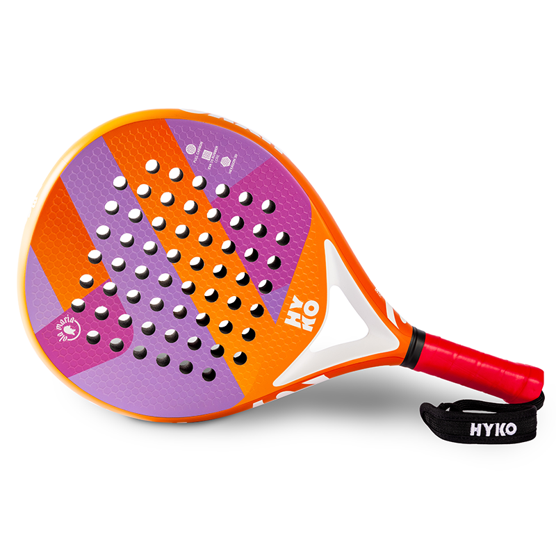 The HYKO Ola Maria padel racket features a round shape, medium EVA core, and full 3K carbon face. Built for effortless control, consistent feel, and smooth power. Its lightweight design, approximately 25g lighter than standard rackets, offers enhanced manoeuvrability without compromising performance.